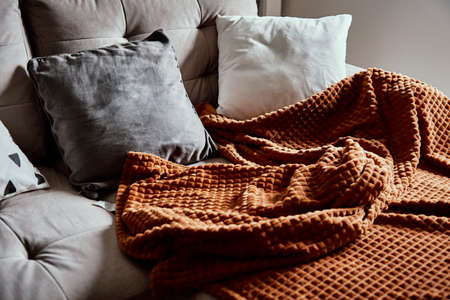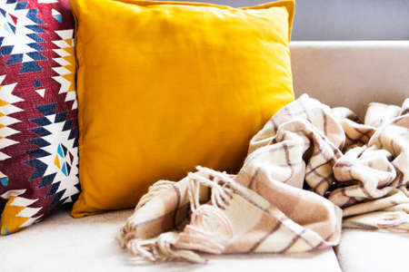 Cushions and plaid on the beige sofa close up with copy space. Sweet home and cozy concept. Indoors
