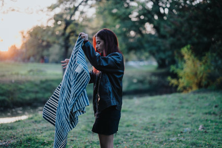 Woman folding a striped blanket outdoors during a serene sunset moment