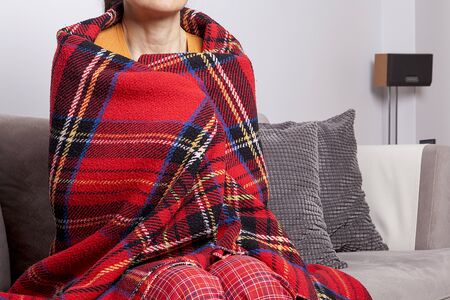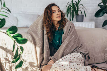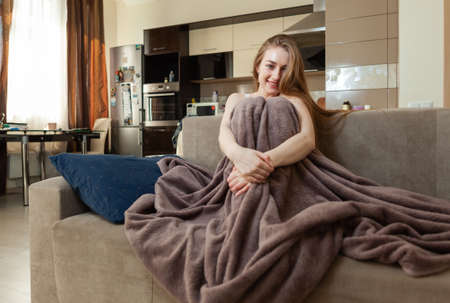 Young woman covered with warm comfortable blanket sits on sofa in living room