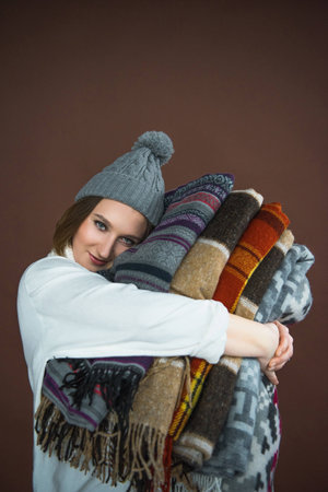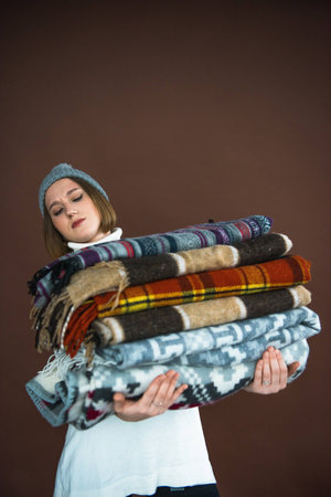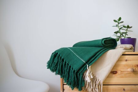 warm cozy blankets stacked on a chair,the concept of warmth and comfort