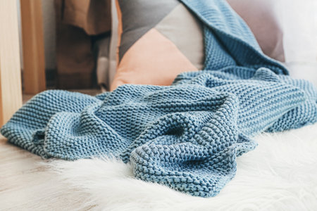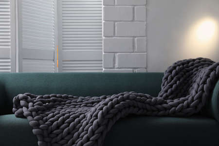 Handmade home textile. Gray warm knitted blanket. Cozy bed.