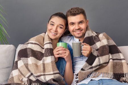 Relationnship Concept. Young couple sitting on sofa hugging covered with blanket studio isolated on grey drinking hot tea smiling happy to camera