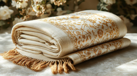 A folded prayer mat adorned with golden embroidery, placed on a smooth surface, with a blurred floral background, symbolizing peace and spirituality during Ramadan.