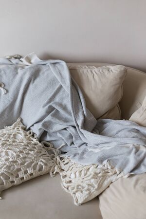 Cozy home concept. Beige sofa with macrame pillows and thin blan