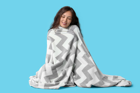 Beautiful young happy Asian woman with warm soft plaid sitting on blue background
