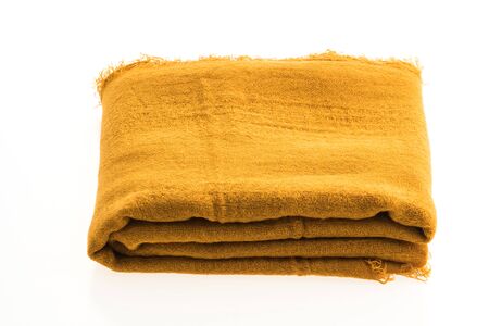 Brown plaid blanket with long edges. Close up view on a white surface. Textile in interior design. Warming up cozy material to cover up when studying or working from home in isolation. Fall vibes.