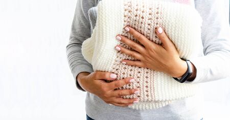 feet and hands of a woman sitting on a carpet on the floor wearing a handmade poncho. background with copy space. concept meditation. horizontal image