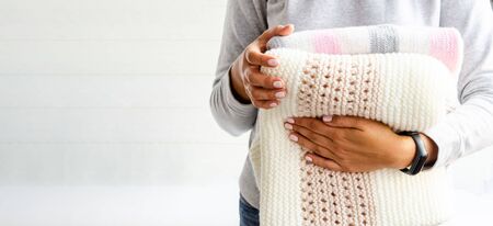 Woman holding stack monochrome white and gray bed linen textiles clothing. Cozy home concept concept