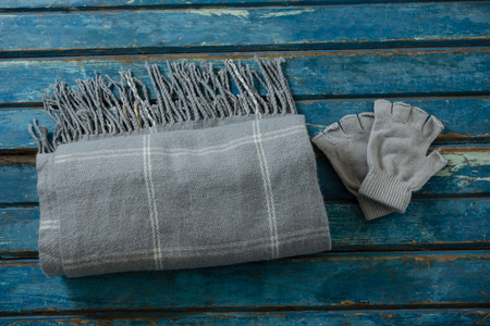 Autumn background. Beautiful gray scarf on a wooden background. Flat lay, top view