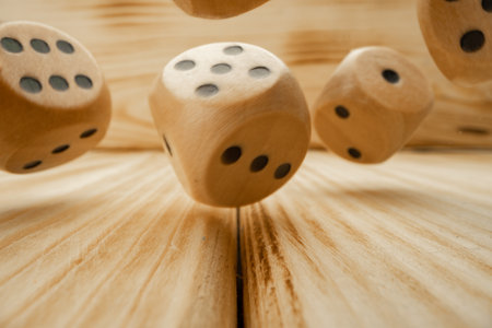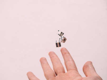 close-up of hand of man rolling dices on green table, being lucky and winning concept