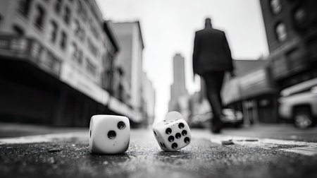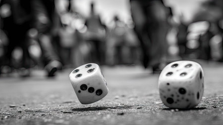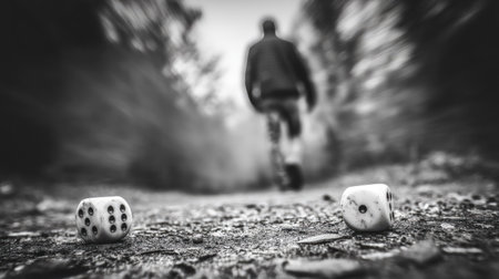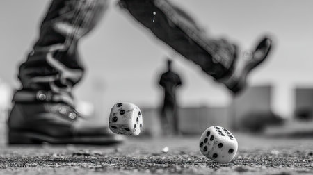 two dice rolling on the ground, one with two dots and the other with three dots. a person is seen in blurred motion in the background on the right side, in black and white, shot from the front view, captured by a canon eos-5d mark iii camera using a wide-angle lens. --chaos 35 --ar 16:9 --quality 2 --v 7 Job ID: d6d0531c-c749-4ea2-b01d-6e170ab6037f