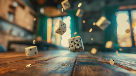 Golden dice are rolling over a rich, velvet green table, leaving a blur in their wake as vibrant lights and shadows enhance the luxurious casino ambiance.