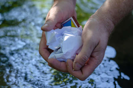 Two men's hands holding a wrinkled piece of paper and a box of matches. A crumpled ball of white paper in hands over the surface of a river or stream. selective focus.