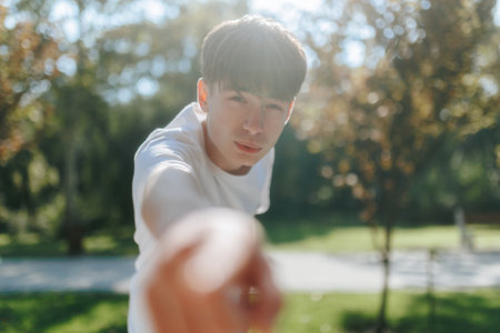 Serious young man pointing at the camera, displaying confidence and focus outdoors.