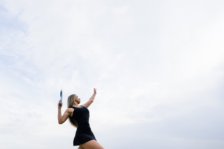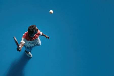A tennis player throws a tennis ball high to hit it, top view.