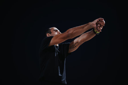 sportsman warming up and practicing javelin throw in yard