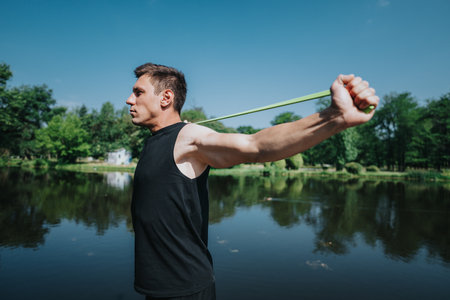 Man exercising with resistance band near a serene outdoor lake setting