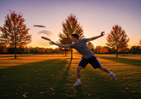 A person joyfully jumps in the air while clutching a frisbee, embodying the spirit of freedom and celebration.