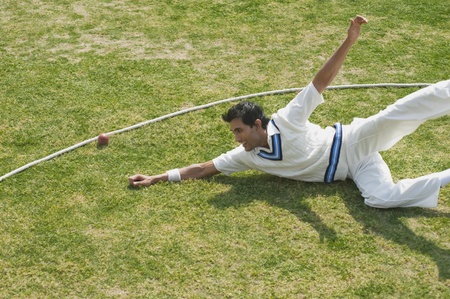 Cricket fielder diving to stop a ball near boundary line