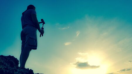 Man silhouette filming on video camera with tripod on the top of mountain. Tourist hiking and taking pictures. Beautiful sunset or sunrise sky. Free copyspace.