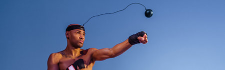 Sporty man with naked torso uses a boxing ball simulator for training on studio background