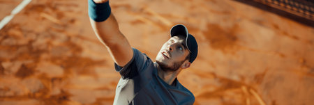 Young Male Tennis Player Serving on Clay Court at Sunrise.