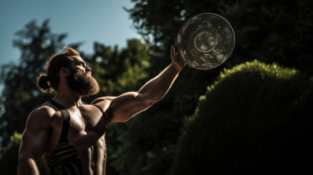 Discus poised for sunlight's kiss an athlete's tension captured in ancient Olympic light