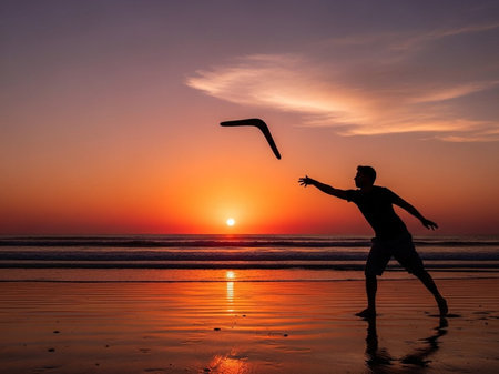 Silhouette of a man playing kite on the beach at sunset