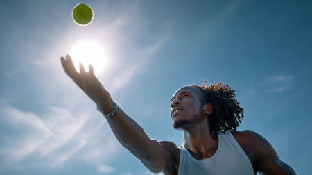 Focused male tennis player serving the ball on an outdoor court under bright sunlight