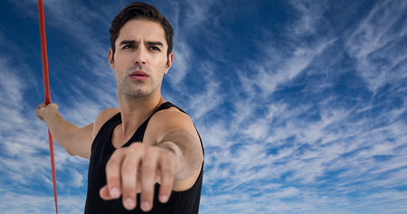 Male athlete preparing to throw javelin against view of the blue sky