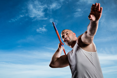 Athlete preparing to throw javelin against blue sky
