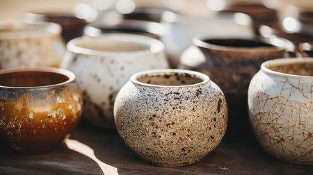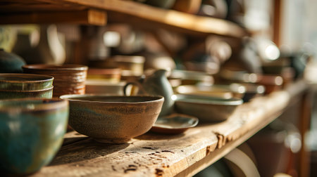 A collection of handmade ceramic pottery bowls and pots sit on rustic wooden table in workshop. warm sunlight creates peaceful and artistic atmosphere of traditional craft