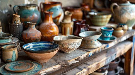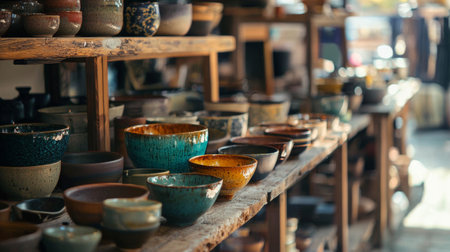 Discover a cozy pottery workshop filled with an array of handcrafted clay vessels, showcasing the beauty of rustic craftsmanship and artistic tradition.