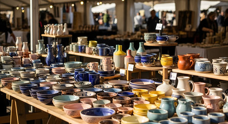 A vibrant pottery market stall displaying a wide variety of handmade mugs, bowls, and vases. The image showcases the colorful craftsmanship of ceramic art arranged on wooden tables for sale at an outdoor fair.