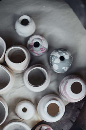 Ceramic vases in pastel colors in the pottery workshop, selective focus