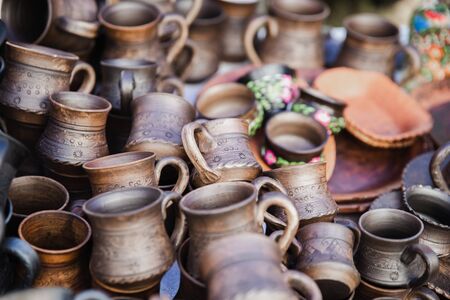 Ceramics. Close-up of red clay dishes craft