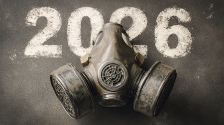 A unique scene featuring a gas mask resting on the ground with the year 2026 boldly painted beside it.