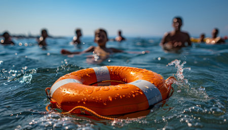A bright orange life jacket floats on calm blue water, symbolizing safety for various water activities. Essential for boating, kayaking, and swimming.