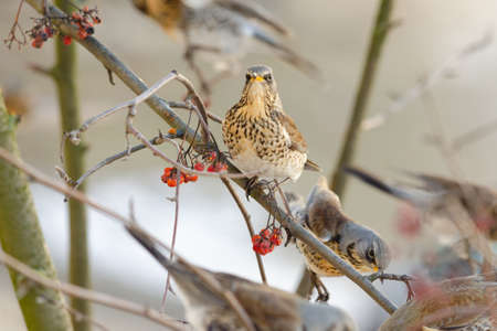 Fieldfare, lat. Turdus pilaris, sitting on the bush and feeding on wild red apples in winter or early spring time.