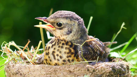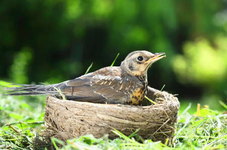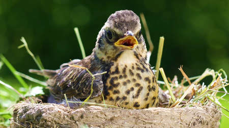 Nestling thrush Fieldfare sitting in a nest against the background of the surrounding nature on a sunny summer day