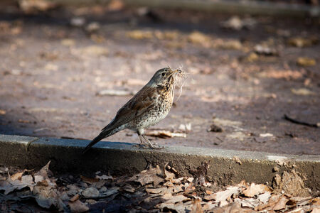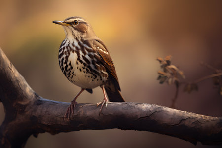 Song thrush (Turdus philomelos) while searching for prey in the bushes in the morning