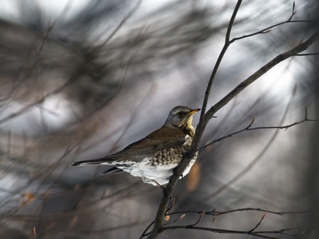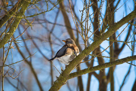 Fieldfare, (Turdus pilaris) is sitting on a branch