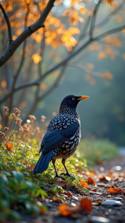 Beautiful blue bird in autumn forest with orange leaves. That the image is generated using AI.
