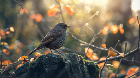 Close-up of birds perched on a moss-covered rock with glowing autumn leaves and warm sunset bokeh in the background.