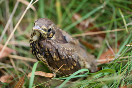 A fieldfare chick, Turdus pilaris, has left the nest and sitting on the spring lawn. A fieldfare chick sits on the ground and waits for food from its parents. Wildlife scene from spring forest.