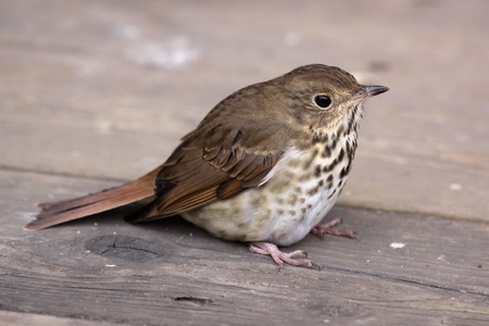 A Wood Thrush (Hylocichla mustelina) sitting on a deck.