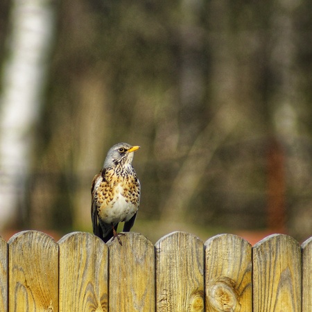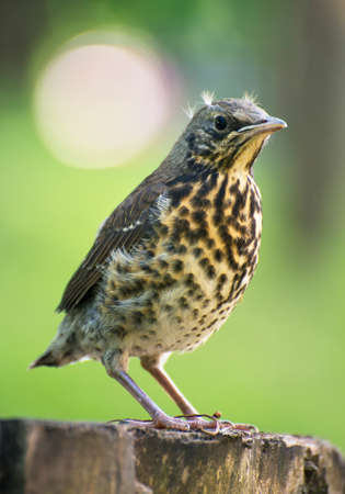 Chick of Fieldfare are sitting on handrail. Summer season in Lithuania
