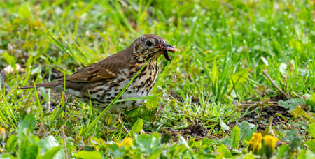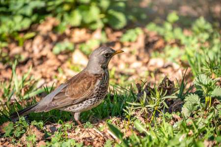 Fieldfare on a spring lawn. Fieldfare, Turdus pilaris. Close-up of foraging parent animal collecting food.