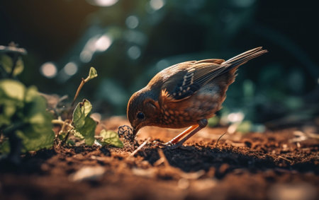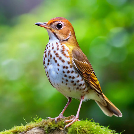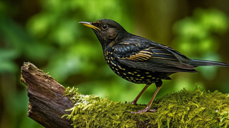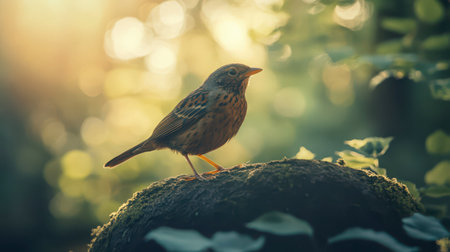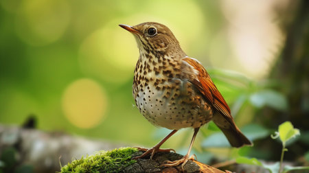 A thrush stands gracefully on a moss covered log in a vibrant forest, surrounded by soft morning light and greenery