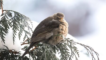 Redwing bird hides in the branches of a coniferous forest in the forest